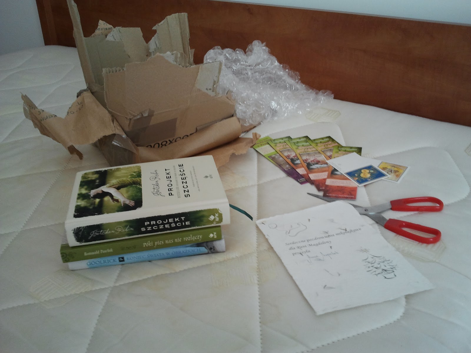 Poniżej pełna prezentacja otwierania paczki:) Ja się nie cackam, rozrywam, żeby jak najszybciej dobrać się do zawartości:) Książki, życzenia i przepiękne zakładki. Zresztą co ja będę pisać, sami zobaczcie:) A Pani Annie serdecznie dziękuję:)